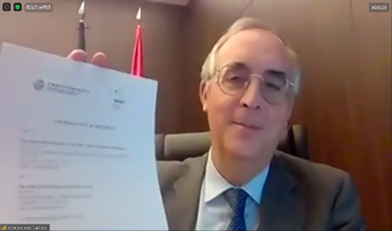 2021年7月8日,中國國際經(jīng)濟貿(mào)易仲裁委員會(CIETAC)與西班牙馬德里國際仲裁中心(MIAC)通過線上方式舉行了《合作協(xié)議》簽署儀式。貿(mào)仲副主任兼秘書長王承杰先生與馬德里國際仲裁中心主席José Antonio Caínzos先生分別代表雙方在《合作協(xié)議》上簽字。馬德里國際仲裁中心秘書長及馬德里律師協(xié)會國際關(guān)系負責(zé)人一同出席了本次儀式。