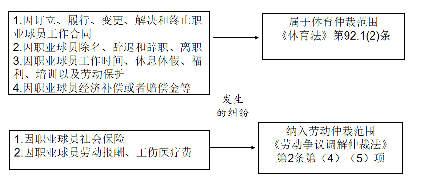 因職業(yè)球員工作合同履行而引發(fā)的糾紛,分別劃分為與勞動有關糾紛(含勞動關系確認、勞動報酬、社會保險、工傷醫(yī)療費糾紛)、與球員身份相關糾紛以及與球員商業(yè)權益有關糾紛,分別納入到勞動仲裁、體育仲裁和商事仲裁(人民法院)的受案范圍,充分利用好現(xiàn)有的糾紛解決機制,推動內外結合的多元化體育解紛機制不斷完善。
