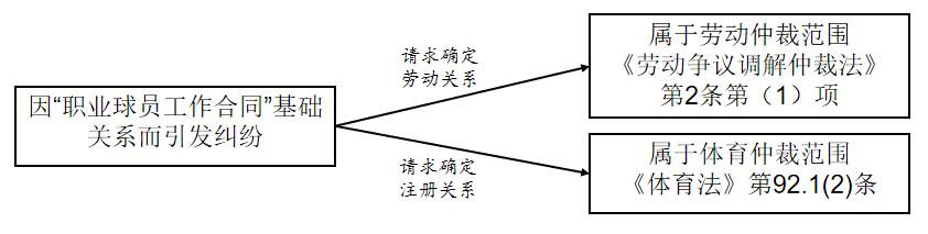 職業(yè)球員是俱樂部勞動者,但是從事特殊勞動勞動者,因此職業(yè)球員不僅具有勞動者身份,也是球員的特殊勞動者身份。因此,依據(jù)球員訴請的內容,來判斷管轄:如請求確認勞動者身份,即勞動關系確認(勞動爭議調解仲裁法第二條第(1)項“因確認勞動關系發(fā)生的爭議”),屬于勞動仲裁范圍;如請求確認球員身份(特殊勞動者),即要求明確球員的注冊身份問題(體育法第九十二條第1款第(2)項“因運動員注冊、交流發(fā)生的糾紛”),則屬于體育仲裁范圍,如下圖。
