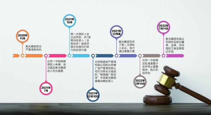 簡單回溯,2020年11月,紫光集團(tuán)由于長期無序收購擴(kuò)張、短貸長投,發(fā)生嚴(yán)重債務(wù)危機(jī)。在資不抵債的情況下,2021年7月,北京一中院根據(jù)債權(quán)人申請,依法裁定紫光集團(tuán)進(jìn)入司法重整,并指定專門工作團(tuán)隊為班底組建清算組擔(dān)任管理人。