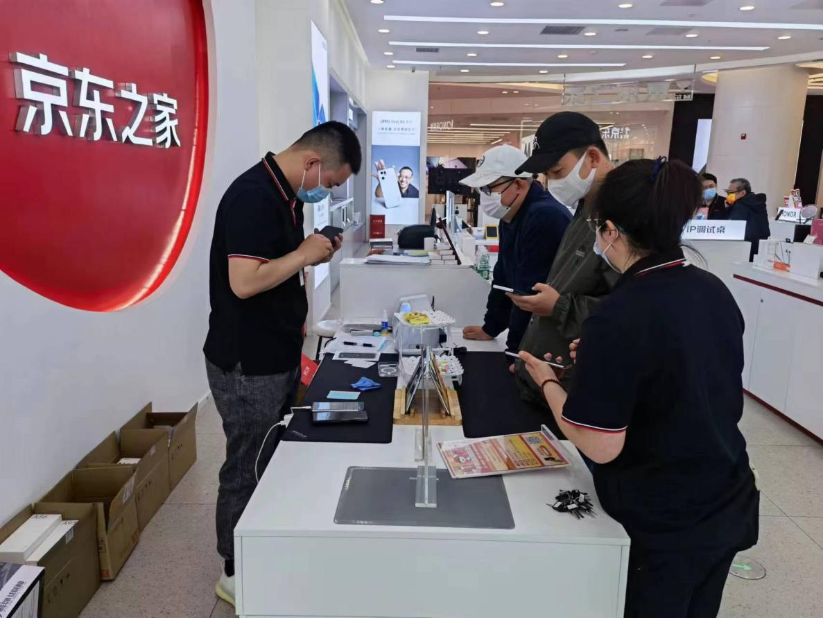 消費(fèi)者在京東之家線下門店體驗(yàn)手機(jī)以舊換新服務(wù)