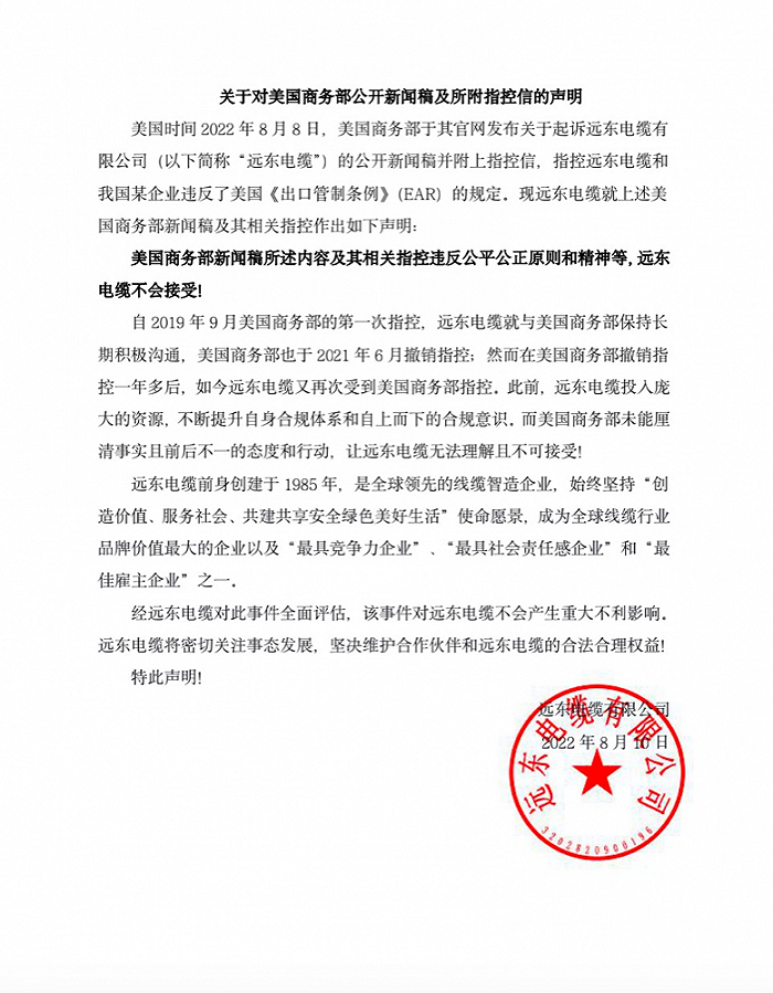 8月11日消息,遠(yuǎn)東電纜有限公司發(fā)布關(guān)于對美國商務(wù)部公開新聞稿及所附指控信的聲明稱,美國商務(wù)部新聞稿所述內(nèi)容及其相關(guān)指控違反公平公正原則和精神等,遠(yuǎn)東電纜不會接受。
