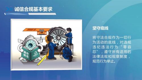 誠信鑄心,合規(guī)立行。中國航發(fā)深入貫徹習近平法治思想,落實全面依法治國戰(zhàn)略,始終堅持誠信合規(guī)經(jīng)營,以誠信涵養(yǎng)健康產(chǎn)業(yè)生態(tài),以合規(guī)凝聚磅礴發(fā)展動力,推動航空發(fā)動機事業(yè)高質(zhì)量發(fā)展?!吨袊桨l(fā)誠信合規(guī)準則》(以下簡稱《準則》)作為集團合規(guī)管理頂層規(guī)范,為全集團誠信合規(guī)經(jīng)營提供了基本的行動指南,對于打造誠信合規(guī)文化、不斷提升集團誠信合規(guī)經(jīng)營管理水平具有重要意義。