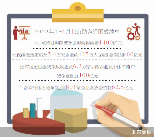 “截至8月1日,北京今年合計(jì)新增減稅降費(fèi)及退稅緩稅緩費(fèi)1400億元;社保緩繳政策惠及3.4萬(wàn)家企業(yè)約115萬(wàn)人,緩繳金額達(dá)到60億元;國(guó)有房屋租金減免政策惠及6.3萬(wàn)家小微企業(yè)及個(gè)體工商戶,減免金額近100億元;“融資紓困直通車”已向801家企業(yè)發(fā)放融資款62.5億元?!贝鞣f介紹道。
