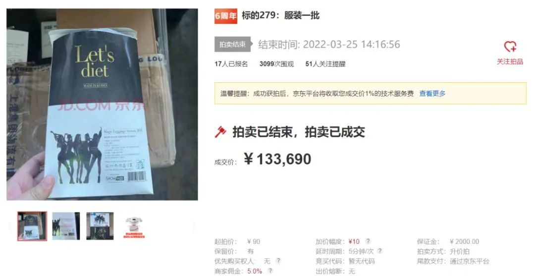 據統(tǒng)計,本次拍賣專場共有1.5萬名用戶設置了關注提醒,總圍觀次數超過了44萬次,參拍用戶共3034名,累計競價次數3萬多次。其中“標的279:服裝一批”起拍價90元,貨量超9000件,最終成交價13.37萬元,溢價率高達148倍,為本次拍賣會溢價率最高的標的?!皹说?86:油畫一批”包括18幅創(chuàng)作精美的畫作,競價次數達到了761次,成了本場拍賣會“最受買家青睞”的拍品。