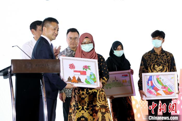 圖為受過(guò)中企捐贈(zèng)的印尼民眾向陸慷大使贈(zèng)送畫(huà)作表達(dá)對(duì)兩國(guó)關(guān)系的祝福