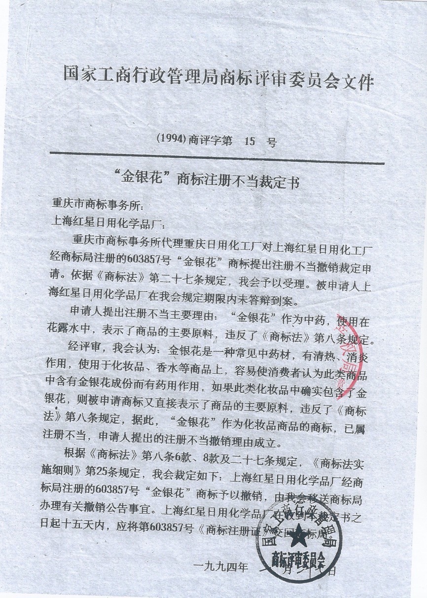 申請(qǐng)人詩(shī)妍公司向法庭展示了(1994)商評(píng)字第15號(hào)“金銀花”商標(biāo)注冊(cè)不當(dāng)裁定書(shū)。這份裁定書(shū)載明,重慶日用化工廠對(duì)上海紅星日用化工廠(金銀花商標(biāo)的注冊(cè)人)提出了商標(biāo)注冊(cè)不當(dāng)撤銷申請(qǐng),當(dāng)時(shí)的國(guó)家工商行政管理局商標(biāo)評(píng)審委員會(huì)作出裁定:對(duì)該商標(biāo)予以撤銷。