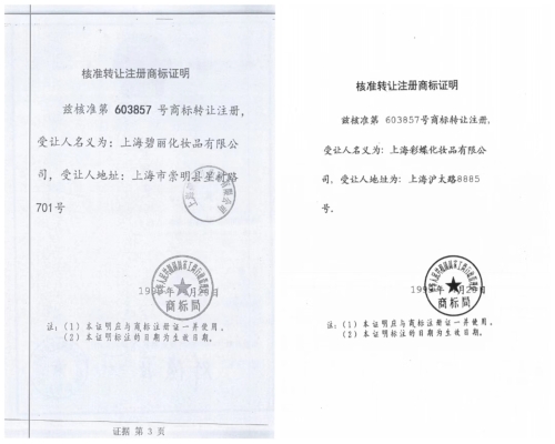 碧麗公司答辯稱,彩蝶廠、紅星廠和碧麗公司是一套班子一套人馬,“核心都是這些人?!痹摴敬_實(shí)曾向法庭提交被指(變?cè)欤┑纳虡?biāo)轉(zhuǎn)讓證,但最終未影響法庭審判。