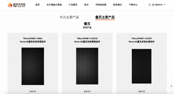 界面新聞注意到,通威太陽(yáng)能官網(wǎng)顯示了七款疊瓦主要產(chǎn)品。在去年年報(bào)中,通威股份在組件部分提到,海外市場(chǎng)重點(diǎn)聚焦歐洲、亞太、南美等終端市場(chǎng),利用各版型疊瓦、半片產(chǎn)品“矩陣”,滿(mǎn)足海外客戶(hù)對(duì)高效組件的差異化需求。