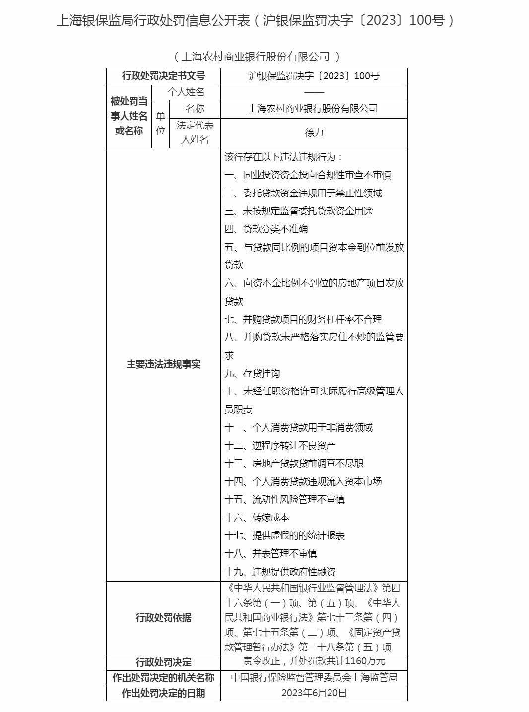 對此,上海銀保監(jiān)局依據(jù)《中華人民共和國銀行業(yè)監(jiān)督管理法》第四十六條第(一)項、第(五)項、《中華人民共和國商業(yè)銀行法》第七十三條第(四)項、第七十五條第(二)項、《固定資產(chǎn)貸款管理暫行辦法》第二十八條第(五)項的規(guī)定,對上海農(nóng)商銀行作出責(zé)令改正,并處罰款共計1160萬元。作出行政處罰決定日期為2023年6月20日。