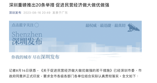 近期,各地促進(jìn)民營經(jīng)濟(jì)發(fā)展的政策舉措密集出臺(tái),深圳也密集推出系列政策舉措。8月7日,深圳三大優(yōu)化營商環(huán)境工作方案正式發(fā)布,立足于市場化、法治化、國際化加快營造一流營商環(huán)境。據(jù)深圳發(fā)布16日消息,《關(guān)于促進(jìn)民營經(jīng)濟(jì)做大做優(yōu)做強(qiáng)的若干措施》(下稱《若干措施》)已經(jīng)深圳市委、市政府同意并正式印發(fā),提出20項(xiàng)舉措,加速釋放民營企業(yè)發(fā)展動(dòng)能。