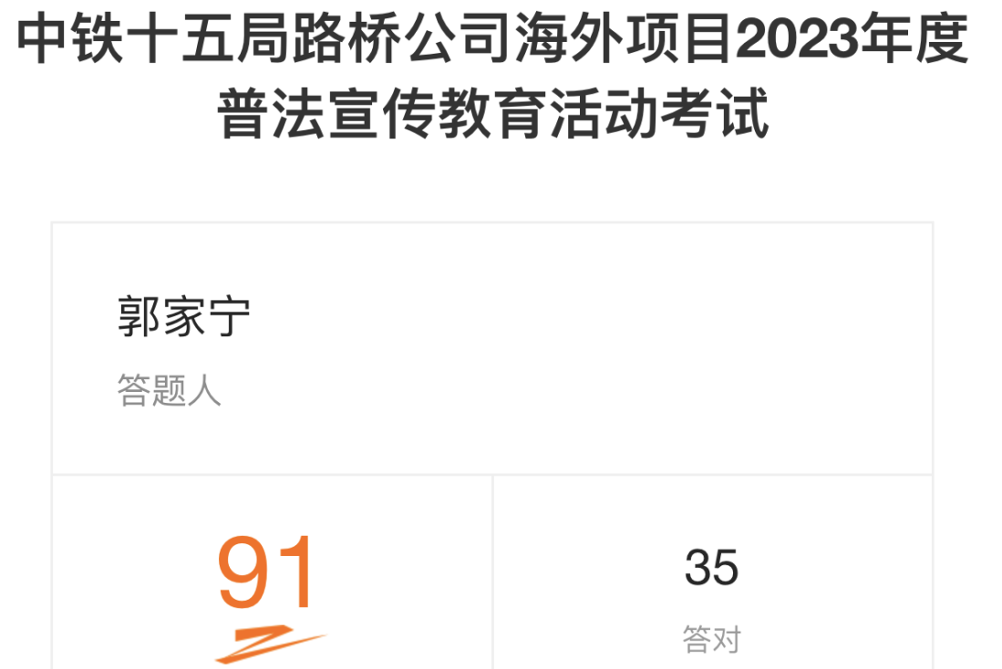 活動(dòng)期間,公司境外項(xiàng)目開展線上法律知識(shí)測試活動(dòng),試卷內(nèi)容涉及憲法、民法 、安全生產(chǎn)法等法律法規(guī)知識(shí),深入貼合職工生活和工作實(shí)際,針對性強(qiáng)。通過以考促學(xué)、以考促用,為建設(shè)法治路橋、平安路橋提供堅(jiān)強(qiáng)有力保障。