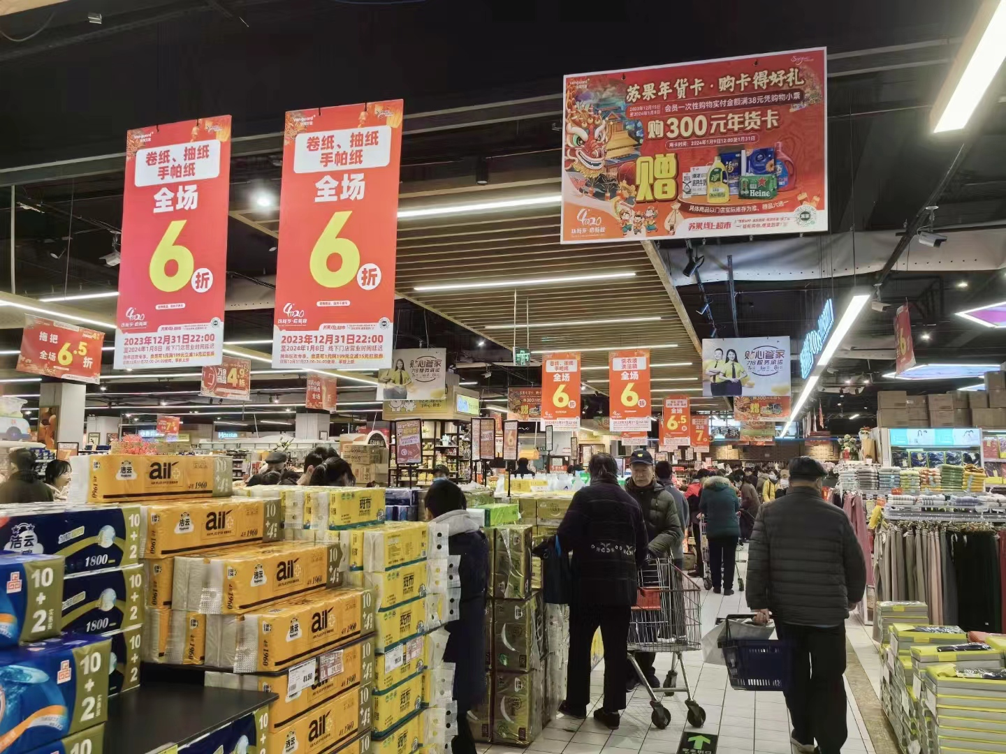 元旦期間,南京市鼓樓區(qū)一家大型蘇果門(mén)店,豐富的商品、給力的折扣,年節(jié)氛圍十分濃郁。消費(fèi)者手推購(gòu)物車在貨架前選購(gòu)心儀的商品,同時(shí)也把“美好生活”的向往裝進(jìn)了購(gòu)物車。