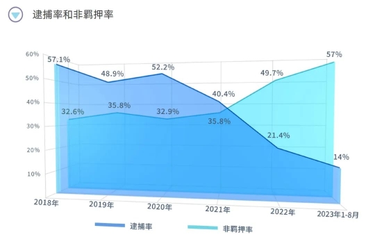 拘留和逮捕等羈押性強制措施是為了保障刑事訴訟順利進行,適用于嚴(yán)重犯罪或者有社會危險性,有再犯、串供等風(fēng)險的案件。輕罪案件因行為本身情節(jié)較輕,社會危害性相對較小,一些抽象危險犯,如危險駕駛罪等,甚至沒有造成實害后果。另外,隨著偵查水平和科技程度的與日俱增,刑事案件的定案對口供的依賴程度明顯降低,尤其法定犯的犯罪性質(zhì)決定了證據(jù)上以客觀證據(jù)為主,辦案過程中對羈押的需求減弱。因此,針對輕罪案件采取羈押措施更為審慎,逮捕強制措施的適用比例不斷降低,取保候?qū)彽确橇b押強制措施的適用比例大幅上升。2018年海淀區(qū)檢察院受理的輕罪案件中,采取逮捕強制措施的為57.1%,采取取保候?qū)彙⒈O(jiān)視居住等非羈押強制措施的為32.6%;2019年,二者占比分別為48.9%、35.8%;2022年,二者比例則為21.4%、49.7%;2023年1-8月,采取逮捕強制措施的比例下降至14%,非羈押強制措施的適用率則上升至57%。