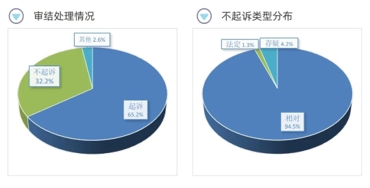 輕罪案件社會危害性較小、罪責(zé)輕,犯罪嫌疑人認(rèn)罪悔過可能性較大。檢察機關(guān)在辦理輕罪案件過程中,更加注重貫徹寬嚴(yán)相濟刑事政策精神,全面落實認(rèn)罪認(rèn)罰從寬制度,輕罪案件處理趨于寬緩。從認(rèn)罪認(rèn)罰從寬制度適用情況看,2018年以來,輕罪案件認(rèn)罪認(rèn)罰從寬制度的適用率達 97.4%;從輕罪案件的審結(jié)處理情況來看,2018年至2023年8月,經(jīng)審查作出起訴決定的11852人,起訴率為65.2%;作出不起訴決定5848人,不起訴率為32.2%,其中94.5%為相對不起訴。
