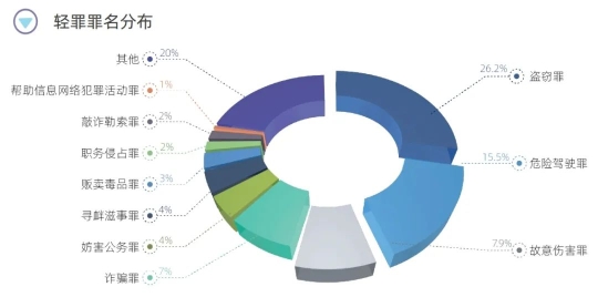 從輕罪案件所涉罪名類型看,海淀區(qū)檢察院受理的輕罪案件涵蓋刑法分則各個章節(jié),涉及150個罪名,以傳統(tǒng)自然犯和新型法定犯、經(jīng)濟犯罪居多。其中,盜竊罪、危險駕駛罪、故意傷害罪是輕罪案件中人數(shù)排名前三的罪名。具體來說,盜竊罪排名第一位,占比26.2%;自醉駕入刑以來,危險駕駛罪持續(xù)高發(fā),排名第二位,占比15.5%;隨著生活節(jié)奏加快、社會關(guān)系更加復(fù)雜,人們由于各種生活摩擦產(chǎn)生的矛盾和糾紛導(dǎo)致的故意傷害類犯罪頻繁發(fā)生,在輕罪案件中排名第三,占比7.9%;另外,自2021年以來,隨著信息化時代到來以及電信網(wǎng)絡(luò)詐騙犯罪高發(fā),與之相關(guān)的幫助信息網(wǎng)絡(luò)犯罪活動罪人數(shù)排名進入輕罪案件前十位。