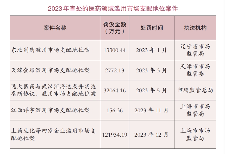 近日,市場(chǎng)監(jiān)管總局(國(guó)家反壟斷局)發(fā)布的《中國(guó)反壟斷執(zhí)法年度報(bào)告 (2023)》透露了這樣一組數(shù)據(jù):2023年全國(guó)查處壟斷協(xié)議、濫用市場(chǎng)支配地位案件27件,罰沒(méi)金額21.63億元。其中,涉及醫(yī)藥領(lǐng)域案件7件,所涉罰沒(méi)金額約17.72億元,占比超過(guò)8成。