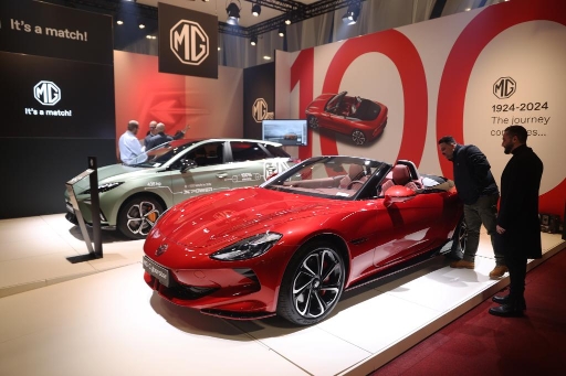 1月17日,人們在比利時布魯塞爾舉辦的2024布魯塞爾汽車展上參觀上汽名爵電動汽車。新華社記者趙丁喆攝