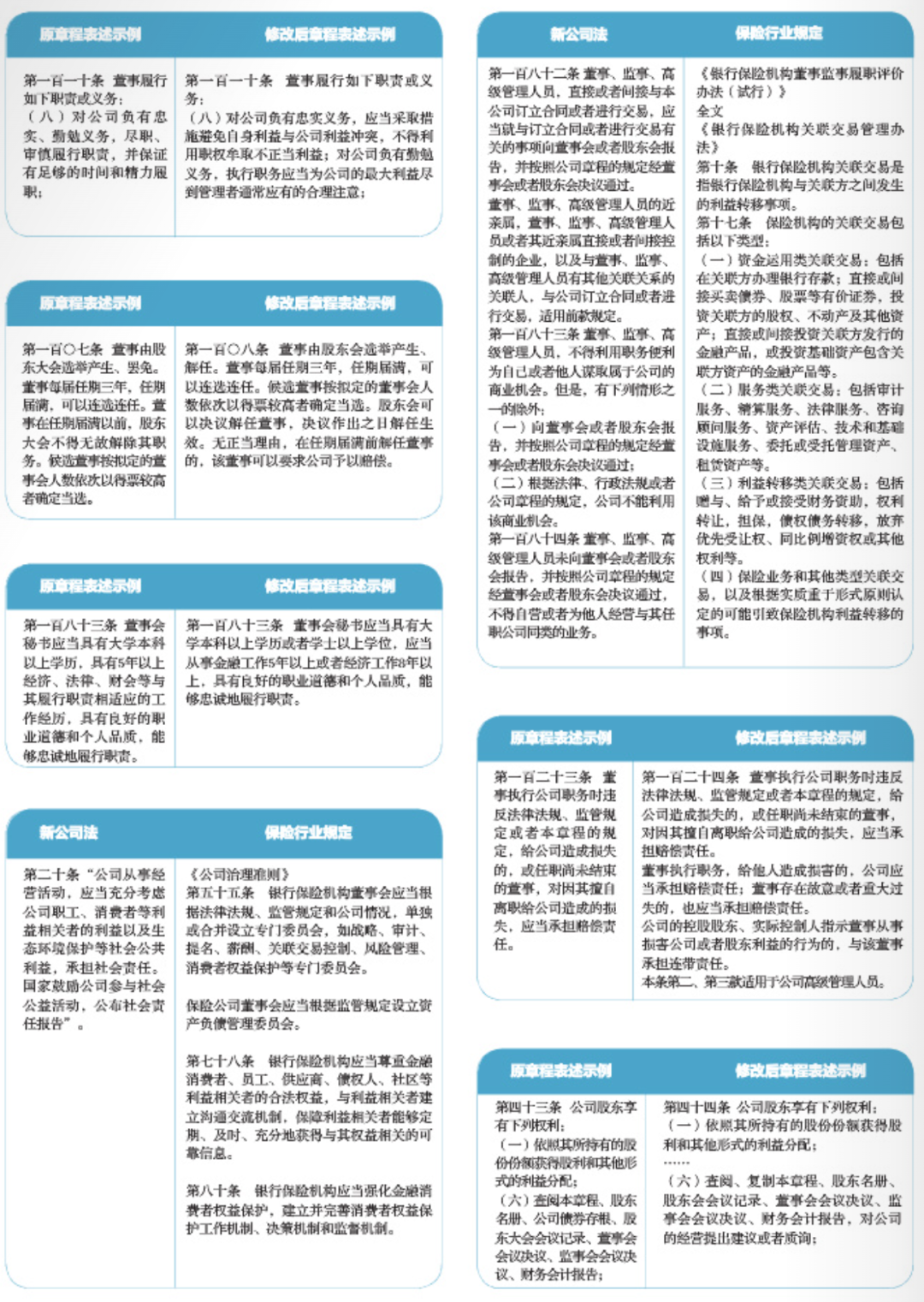 新公司法對(duì)保險(xiǎn)公司治理架構(gòu)產(chǎn)生了多方面的影響,加強(qiáng)了對(duì)控股股東和實(shí)際控制人的規(guī)范和對(duì)中小股東的保護(hù),此將有助于維護(hù)保險(xiǎn)市場(chǎng)的穩(wěn)定和公平,靈活簡(jiǎn)化董事會(huì)和監(jiān)事會(huì)的設(shè)置安排,明確董、高、監(jiān)的忠實(shí)勤勉義務(wù),強(qiáng)化職工民主管理,有助于保險(xiǎn)機(jī)構(gòu)提升公司治理效率和水平,這些對(duì)于保險(xiǎn)公司修訂章程產(chǎn)生了重要影響。筆者認(rèn)為,需要根據(jù)新公司法的修訂內(nèi)容并考慮保險(xiǎn)監(jiān)管相關(guān)法規(guī)要求,相應(yīng)修訂公司章程的條款。