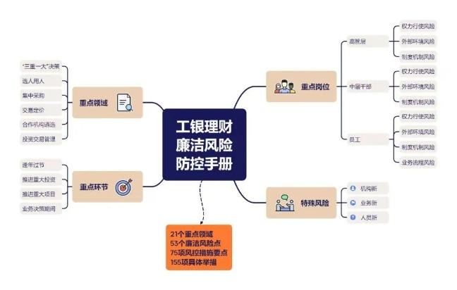 工銀理財黨委深入貫徹落實集團廉潔風(fēng)險深化治理專項行動部署要求,清醒地認識到金融反腐嚴峻復(fù)雜的斗爭形勢,強化全面從嚴治黨主體責(zé)任和監(jiān)督責(zé)任。把握關(guān)鍵領(lǐng)域,突出重點治理,把清廉理財建設(shè)融入公司經(jīng)營管理全過程各領(lǐng)域,在資管行業(yè)中首家發(fā)布“清風(fēng)理財 廉筑紅心”清廉文化品牌,積極打造與清廉工行目標(biāo)相匹配、與干部群眾期盼相呼應(yīng)的標(biāo)桿清廉理財公司。公司創(chuàng)新制定《廉潔風(fēng)險防控手冊》(以下簡稱《手冊》)、加強廉潔風(fēng)險防控和內(nèi)控合規(guī)管理的業(yè)務(wù)實踐得到中央紀委國家監(jiān)委駐中國工商銀行紀檢監(jiān)察組的高度認可,將《手冊》作為范本推廣至工銀集團內(nèi)各機構(gòu),并入選全國第二屆企業(yè)法治建設(shè)創(chuàng)新成果案例?!妒謨浴穼崿F(xiàn)了三個創(chuàng)新。