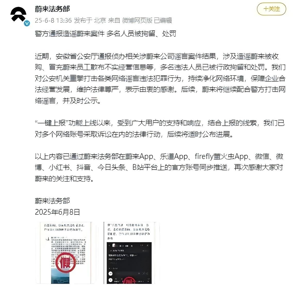 以上內(nèi)容已通過蔚來法務(wù)部在蔚來App、樂道App、firefly螢火蟲App、微信、微博、小紅書、抖音、今日頭條、B站平臺(tái)上的官方賬號(hào)同步推送,再次感謝大家對(duì)蔚來的關(guān)注和支持。
