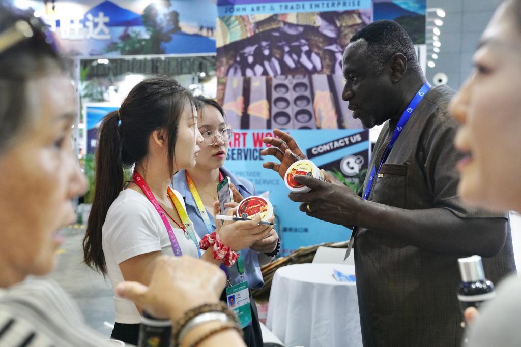 不遠(yuǎn)處的布隆迪展區(qū),當(dāng)?shù)卦现圃斓睦蹦咀延?、辣木籽身體香膏也吸引著不少專(zhuān)業(yè)觀眾前來(lái)問(wèn)詢(xún)、試用。短短半天,已有20多個(gè)采購(gòu)商留下對(duì)接方式。