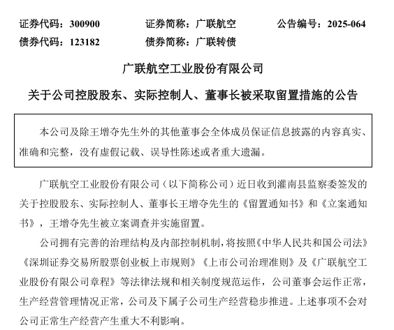 7月22日晚間,廣聯(lián)航空公告,控股股東、實(shí)控人、董事長(zhǎng)王增奪被立案調(diào)查并實(shí)施留置。