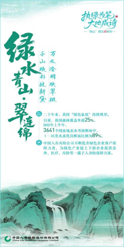 青山鋪卷,金融作筆;執(zhí)筆為綠,大地成詩。在奔赴“雙碳”目標的壯闊征途上,中國人壽正以中國式ESG的生動實踐,為全球可持續(xù)發(fā)展貢獻東方智慧,書寫著不負綠水青山的時代新篇。