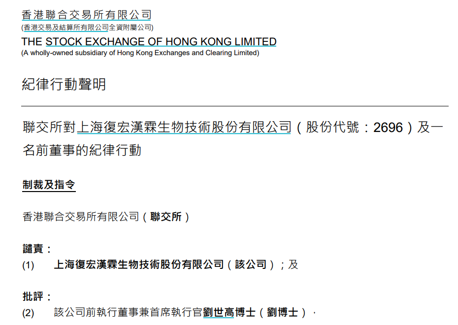 9月2日,復(fù)宏漢霖(2696.HK)公告了一份聯(lián)交所對公司及一名前董事的紀(jì)律行動(dòng)聲明。文件顯示,復(fù)宏漢霖受到港交所譴責(zé),而公司前執(zhí)行董事兼CEO劉世高受到批評。港交所要求劉世高接受26小時(shí)有關(guān)監(jiān)管和法律議題以及上市規(guī)則合規(guī)事宜的培訓(xùn),才能再獲委任為任何已于或?qū)⒂诼?lián)交所上市的公司董事。