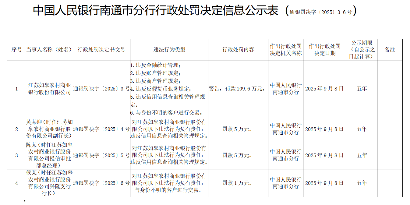 9月16日,中國人民銀行江蘇省分行網(wǎng)站發(fā)布的一則行政處罰信息顯示,江蘇如皋農(nóng)村商業(yè)銀行股份有限公司(以下簡稱“如皋農(nóng)商銀行”)因存在多項業(yè)務違規(guī)行為,被中國人民銀行南通市分行給予警告,并處以109.6萬元罰款。同時,該行3名相關(guān)責任人也受到處罰。