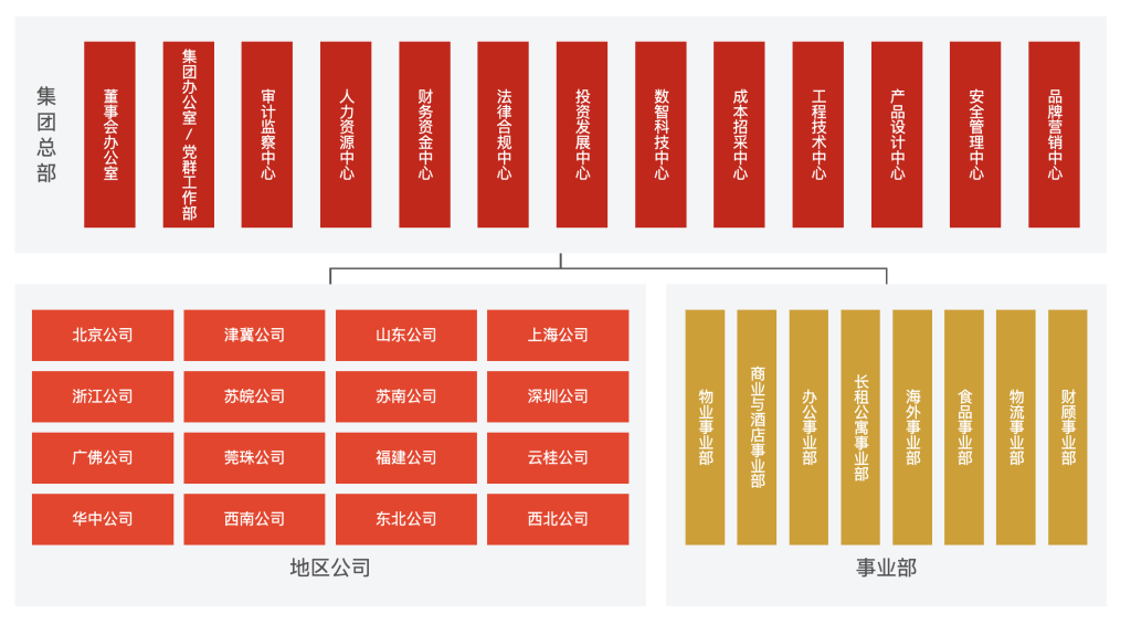 根據最新的組織架構,萬科集團總部除了董事會辦公室、集團辦公室/黨群工作部外,還設有投資發(fā)展中心、成本招采中心、工程技術中心、產品設計中心等11個中心;地區(qū)公司分為北京公司、津冀公司、山東公司、上海公司等16個公司;原物業(yè)事業(yè)集團(BG)等統(tǒng)一歸為事業(yè)部,目前包含物業(yè)、商業(yè)與酒店、辦公、長租公寓、物流等八大多元化業(yè)務。