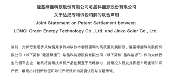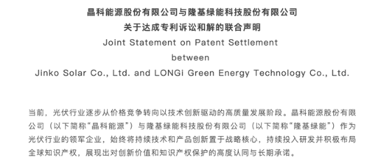 聲明以中英雙語呈現(xiàn),稱隆基綠能與晶科能源聯(lián)合宣布,就雙方及雙方關聯(lián)公司在全球范圍內(nèi)正在進行的相關專利主張和法律事項,達成和解協(xié)議。