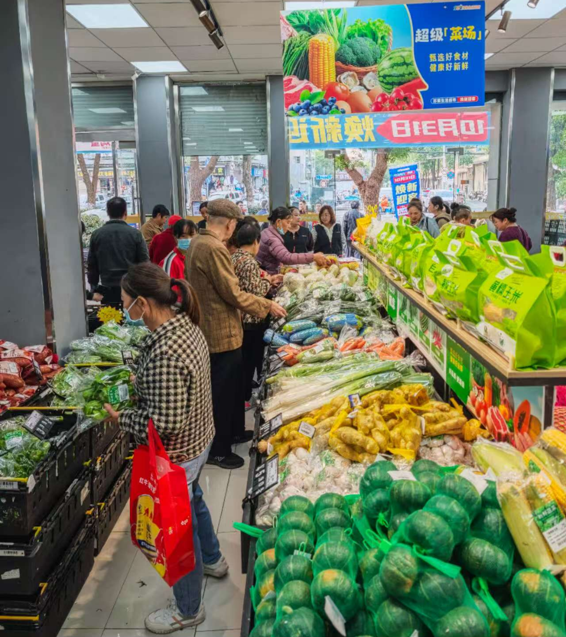 當(dāng)天一大早,蘇果生活超市板橋店門口聚集了眾多聞訊而來的周邊居民。大門打開的瞬間,熱情的人群涌入店內(nèi),溫馨明亮的燈光、整潔有序的貨架與撲面而來的食物香氣,瞬間點(diǎn)燃了冬日的清晨。