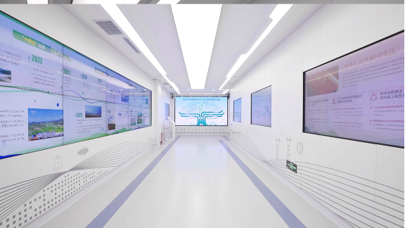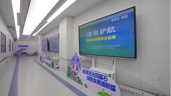 該基地占地約400平方米,配備數(shù)字互動(dòng)終端、智慧調(diào)控系統(tǒng)、成果展示臺(tái)等設(shè)施。其展廳設(shè)計(jì)以“法治冀北·綠色希冀——能源法治守護(hù)綠水青山”為核心主題,設(shè)置序廳、“能源法·起航”、“能源法·踐行”、“能源法·未來(lái)”四大展區(qū),通過(guò)“圖片+視頻+講解”三位一體的展示方式,系統(tǒng)呈現(xiàn)能源法的立法背景、核心制度及重要意義。