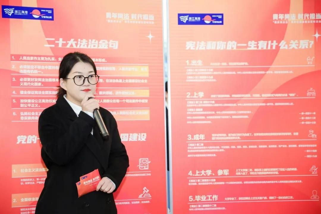 活動現(xiàn)場特別設(shè)置了憲法授課、憲法飛行棋、法律連連看、“法”影重重、法律問答、合規(guī)分分樂等六個法律主題趣味互動區(qū)域,通過“學(xué)憲集章”打卡的形式,引導(dǎo)參與者在參觀中學(xué)習(xí)、在互動中領(lǐng)悟,現(xiàn)場學(xué)習(xí)氛圍濃厚。憲法館講解員與集團普法志愿者也同步在現(xiàn)場向廣大群眾開展憲法法治和海港法治建設(shè)實踐宣傳。