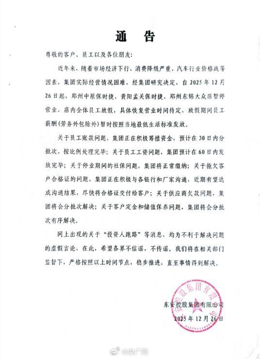 東安集團(tuán)稱,近年來,汽車行業(yè)價(jià)格戰(zhàn)等因素,集團(tuán)實(shí)際經(jīng)營情況困難,經(jīng)集團(tuán)研究決定,自2025年12月26日起,鄭州中原保時(shí)捷、貴陽孟關(guān)保時(shí)捷、鄭州東錦大眾店暫停營業(yè)。