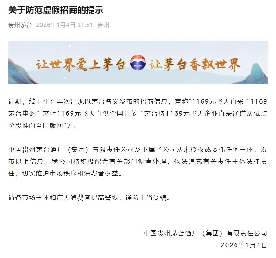 1月4日晚,茅臺集團發(fā)布關于防范虛假招商的提示:近期,線上平臺再次出現(xiàn)以茅臺名義發(fā)布的招商信息,聲稱“1169元飛天直采”“1169茅臺申購”“茅臺1169元飛天直供全國開放”“茅臺將1169元飛天企業(yè)直采通道從試點階段推向全國版圖”等。