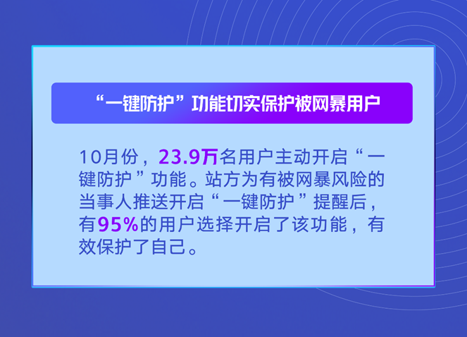 10月份,微博有23.9萬名用戶主動開啟“一鍵防護”功能。微博為有被網(wǎng)暴風險的當事人推送開啟“一鍵防護”提醒后,有95%的用戶選擇開啟了該功能,有效保護了自己。