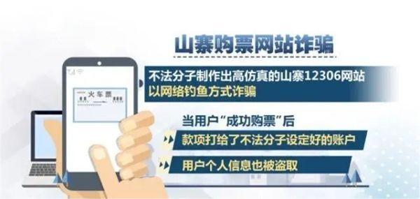 山寨購(gòu)票網(wǎng)站詐騙:不法分子制作出高仿真的山寨12306網(wǎng)站,以網(wǎng)絡(luò)釣魚方式詐騙,這些網(wǎng)站在頁(yè)面布局、域名上與12306網(wǎng)站非常相似。當(dāng)用戶“成功購(gòu)票”后,款項(xiàng)打給了不法分子設(shè)定好的賬戶,用戶個(gè)人信息也被盜取。