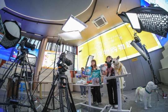 ▲互聯(lián)網(wǎng)營銷師培訓機構(gòu)水平參差不齊。圖為浙江省平陽縣寵物小鎮(zhèn)客廳內(nèi),眾多主播直播帶貨。 CFP