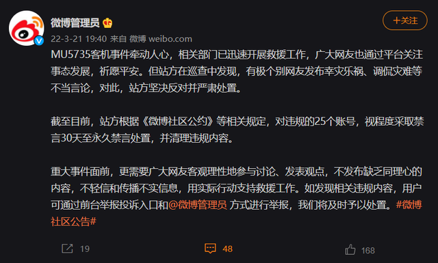 3月21日,“微博管理員”表示, MU5735 客機事件牽動人心,相關部門已迅速開展救援工作,廣大網友也通過平臺關注事態(tài)發(fā)展,祈愿平安。但站方在巡查中發(fā)現,有極個別網友發(fā)布幸災樂禍、調侃災難等不當言論,對此,站方堅決反對并嚴肅處置。
