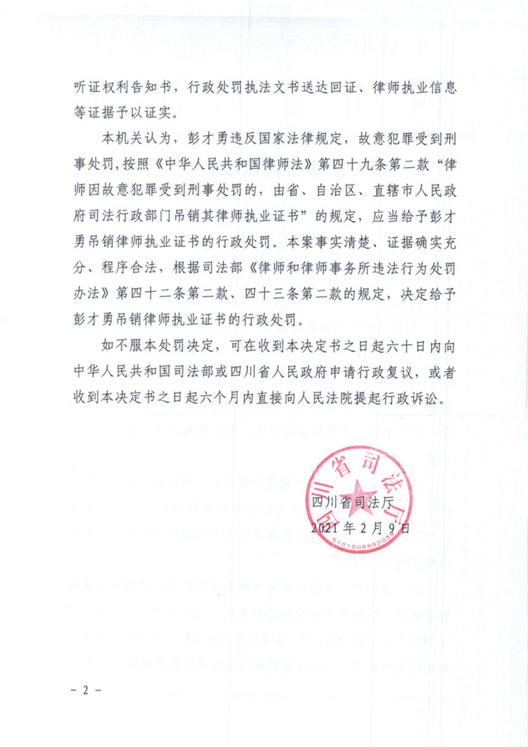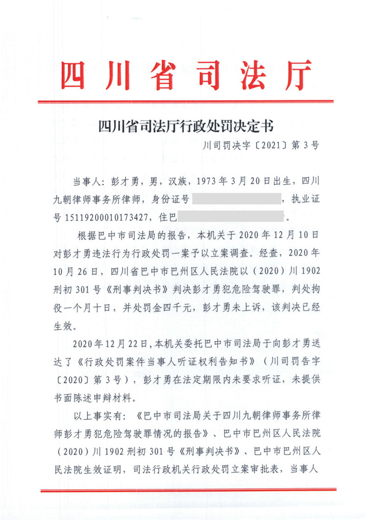 四川彭才勇因犯危險(xiǎn)駕駛罪被處吊銷律師執(zhí)業(yè)證書