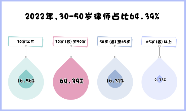 從年齡結(jié)構(gòu)看,截至2022年底,全國(guó)律師隊(duì)伍涵蓋老中青各年齡段,其中30歲以下的律師10.79萬(wàn)多人,占比16.56%,30歲(含)至50歲的律師41.95萬(wàn)多人,占比64.39%,律師隊(duì)伍呈現(xiàn)年輕化趨勢(shì)。