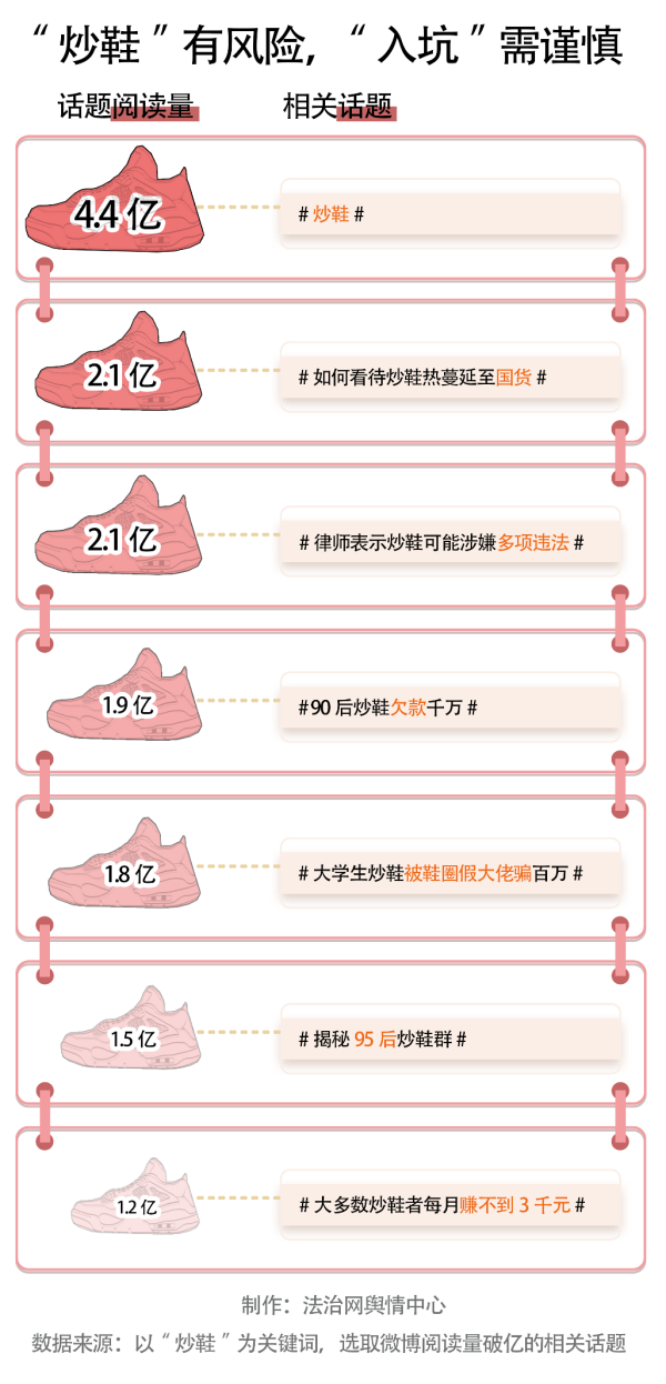 微博話題“揭秘95后炒鞋群”的相關(guān)閱讀量達(dá)到了1.9億,其中,有些95后炒鞋者靠“炒鞋”一夜暴富,也有不少炒鞋者虧得血本無(wú)歸,甚至有炒鞋者卷入經(jīng)濟(jì)糾紛或涉嫌違法。