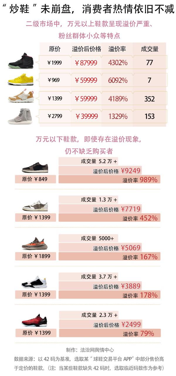 近年來(lái),有關(guān)“炒鞋”的話題熱度不斷,一雙原本幾百塊的球鞋,可能迅速被炒至幾倍甚至幾十倍,造成這種大幅度溢價(jià)的原因在于鞋款的話題性、曝光度、稀有程度等。因“炒鞋”能夠獲取巨大利益,致使市場(chǎng)中出現(xiàn)了“炒鞋”黑產(chǎn)鏈條,同時(shí)也引發(fā)了輿論對(duì)“炒鞋”是否合法、溢價(jià)是否合理等話題的關(guān)注。