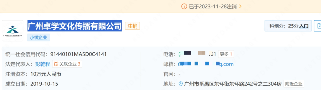 莫女士則通過查詢寄送學(xué)習(xí)機(jī)的快遞,獲取了“廣州教研中心”的地址和電話。信息顯示,這是一個(gè)名為“廣州卓學(xué)文化傳播有限公司”的小微企業(yè),但是于2023年11月已經(jīng)注銷。