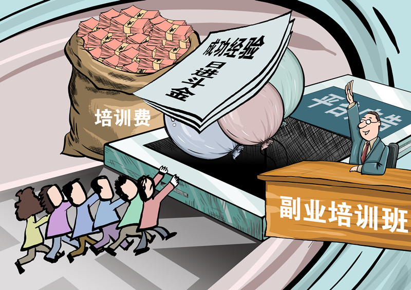 劉云的遭遇并非個例。南京大學(xué)一項調(diào)研數(shù)據(jù)顯示,我國一邊工作一邊干副業(yè)的人已經(jīng)超過8000萬。如此龐大的人群,迅速點燃了職業(yè)培訓(xùn)市場。從緊隨低碳風(fēng)潮推出的碳排放管理師報考培訓(xùn)班到伴隨直播帶貨興起的個人IP“點金術(shù)”,從60天速成月入過萬元的自媒體寫手、到學(xué)習(xí)20天就能接單的手辦課……眼花繚亂的培訓(xùn)中摻雜各種亂象,讓“劉云”們成了被割的“韭菜”。