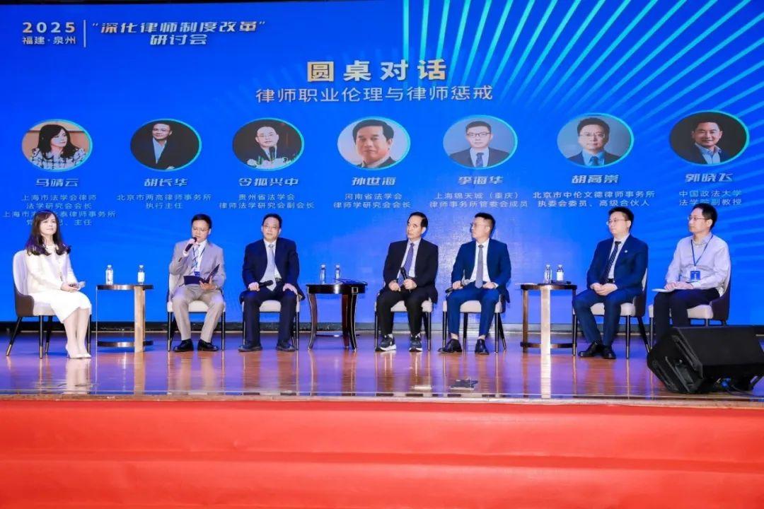 在圓桌對(duì)話環(huán)節(jié)中,北京市兩高律師事務(wù)所執(zhí)行主任胡長華、貴州省法學(xué)會(huì)律師法學(xué)研究會(huì)副會(huì)長令狐興中、河南省法學(xué)會(huì)律師學(xué)研究會(huì)會(huì)長孫世海、上海錦天城(重慶)律師事務(wù)所管委會(huì)成員李海華、北京市中倫文德律師事務(wù)所執(zhí)委會(huì)委員、高級(jí)合伙人胡高崇、中國政法大學(xué)法學(xué)院副教授郭曉飛圍繞“律師職業(yè)倫理與律師懲戒”進(jìn)行交流,上海市法學(xué)會(huì)律師法學(xué)研究會(huì)會(huì)長、上海市海華永泰律師事務(wù)所黨委書記、主任馬靖云主持。