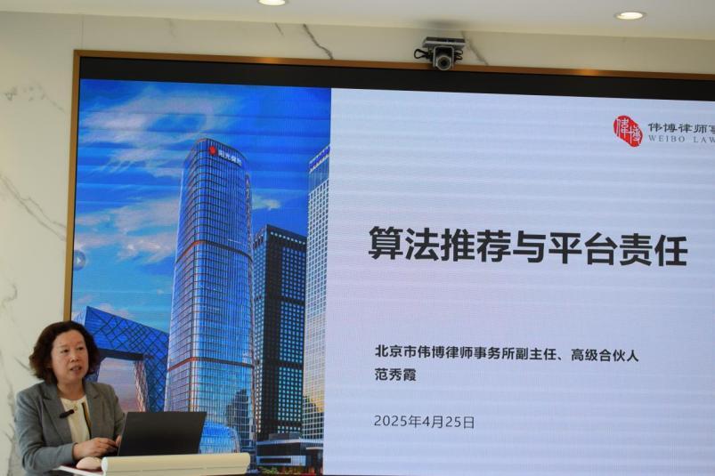 偉博律所副主任范秀霞律師以《算法推薦與平臺責(zé)任》為題,結(jié)合避風(fēng)港原則、紅旗原則等法律規(guī)定,對算法推薦服務(wù)提供者應(yīng)承擔(dān)的注意義務(wù)點進行了提示;結(jié)合司法審判中的具體案例,明確平臺主動審查與被動審查的區(qū)別,合理界定了算法推薦服務(wù)者的責(zé)任邊界。范秀霞認為,可以通過運用技術(shù)手段、完善內(nèi)部制度建設(shè)等方式,實現(xiàn)平臺與權(quán)利人的互利共贏,共同營造健康的網(wǎng)絡(luò)內(nèi)容生態(tài)。