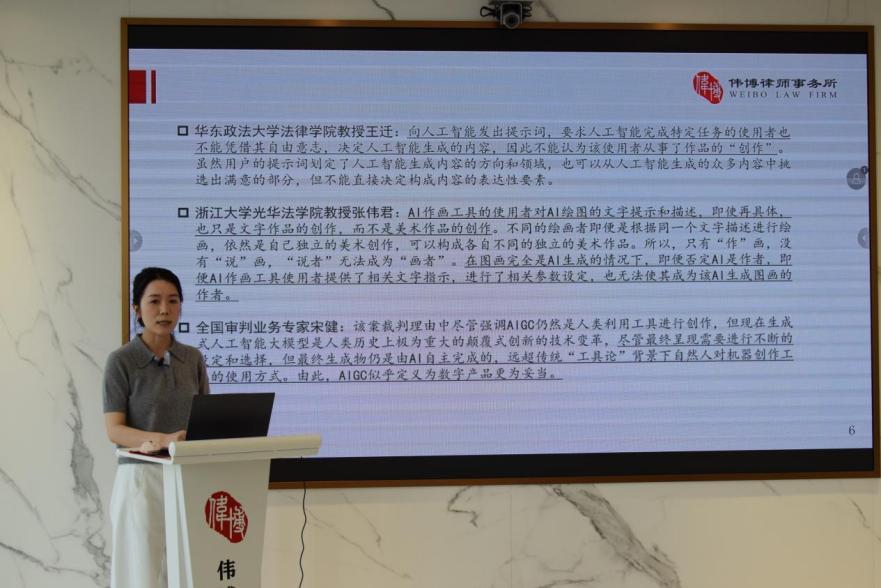 偉博律所律師曹琳娜以《AIGC司法裁判最新動向》為題,聚焦行業(yè)前沿,深入分析了近期備受關(guān)注的“春風(fēng)案”和“蝴蝶椅案”背后的核心問題。曹琳娜認為,司法實踐需認真審視AI軟件用戶與AI軟件的交互關(guān)系,審慎考量作品性質(zhì),并從法律要件的角度進行分析定性,而“蝴蝶椅案”對AIGC產(chǎn)業(yè)的發(fā)展和對AIGC產(chǎn)物的應(yīng)用與保護作出了有益探索。